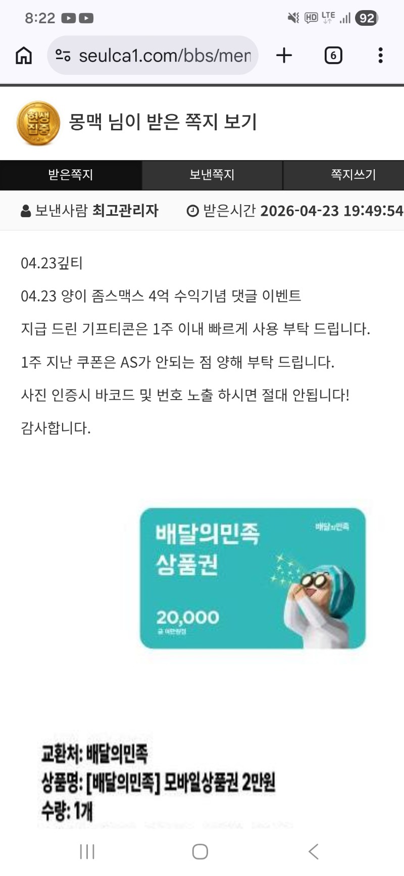 막내양이형 맥스기념 후기댓글 배민슛~ 몽맥 4 0 0 20:23:26 *기프티콘 바코드 노출 주의* <- 맛있게 잘먹을께요! 0 0 https://seulca1.com/bbs/board.php?bo_table=free&wr_id=3827113 Author 51 26 Lv.19 몽맥 19 224,120,271 (0%) 몽맥님 보유 포인트 : P 3,019,638 04.23 시안랜덤번호는 1번입니다. +4 04.23 막내양이형 맥스기념 후기댓글 배민슛~ +8 04.23 시안 형난응원이벤트 가부르좌~ +20 04.23 곧 출시될 스위트보난자250 정보공(추겜인기로예상) +3 04.23 나는 착하다 나는 잘생겼다!