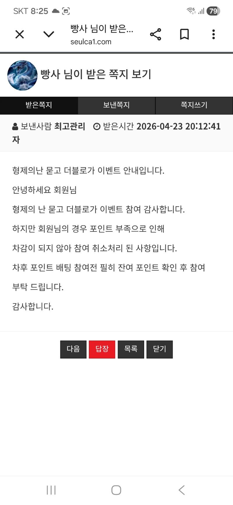 아~싸 오랜만에 받는 쪽지다~~ 빵사 2 0 0 20:27:03 *기프티콘 바코드 노출 주의* <- 용호가 내슬포 다털어가서 ㅋㅋ 0 0 https://seulca1.com/bbs/board.php?bo_table=free&wr_id=3827116 Author 3 0 Lv.17 빵사 17 84,933,962 (49%) 빵사님 보유 포인트 : P 6,399 +2 04.23 아~싸 오랜만에 받는 쪽지다~~ +2 04.23 양이 맥스 배민ㅅ +12 04.23 토라메 바닥 451배 +16 04.23 이겨도 멘징.. +16 04.23 이겼지만 배당도 없고