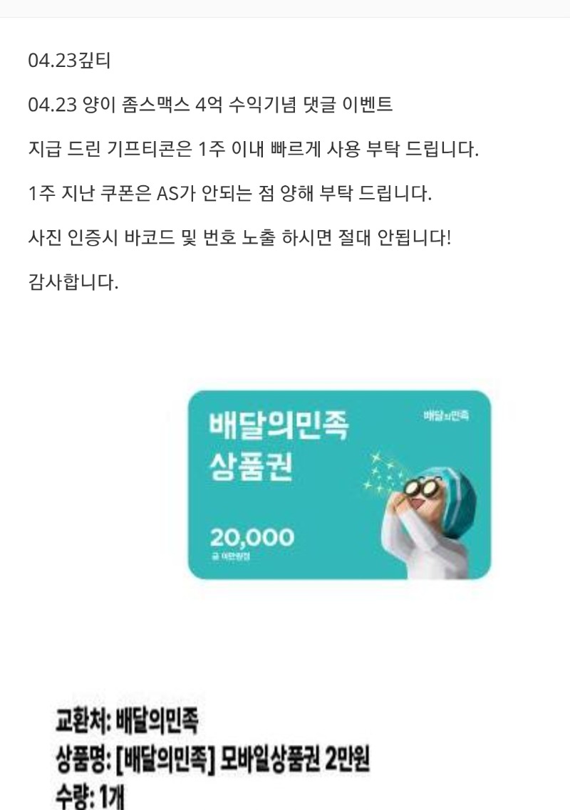 양이 맥스 배민 땡큐~ 이실로테2 0 0 0 20:35:50 *기프티콘 바코드 노출 주의* <- 얼마만에 이벤트 당첨이냐~ 양이 땡큐~~ 0 0 https://seulca1.com/bbs/board.php?bo_table=free&wr_id=3827146 Author 2 2 Lv.13 이실로테2 13 19,358,781 (27%) 이실로테2님 보유 포인트 : P 10,297 04.23 크.찔끔 모아서 형난갔더니 사망이군 04.23 양이 맥스 배민 땡큐~ +1 04.23 리필이모 +8 04.23 일복 10등.. +1 04.22 리필이모~