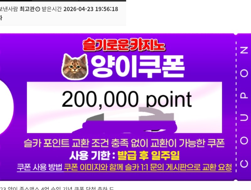 양이 수익쿱 짱형님 1 0 0 21:51:59 *기프티콘 바코드 노출 주의* <- 와~~ 비쿱 얼마만인지 기억도 안나네영 감사합니당!! 잘써볼게용 0 0 https://seulca1.com/bbs/board.php?bo_table=free&wr_id=3827290 Author 0 0 Lv.10 짱형님 10 8,004,053 (0%) 짱형님님 보유 포인트 : P 0 04.23 양이수익쿱. 수정본 +1 04.23 양이 수익쿱 +7 04.23 포오기 102배 +41 04.22 닭집 288배 +35 04.22 멀린 560배