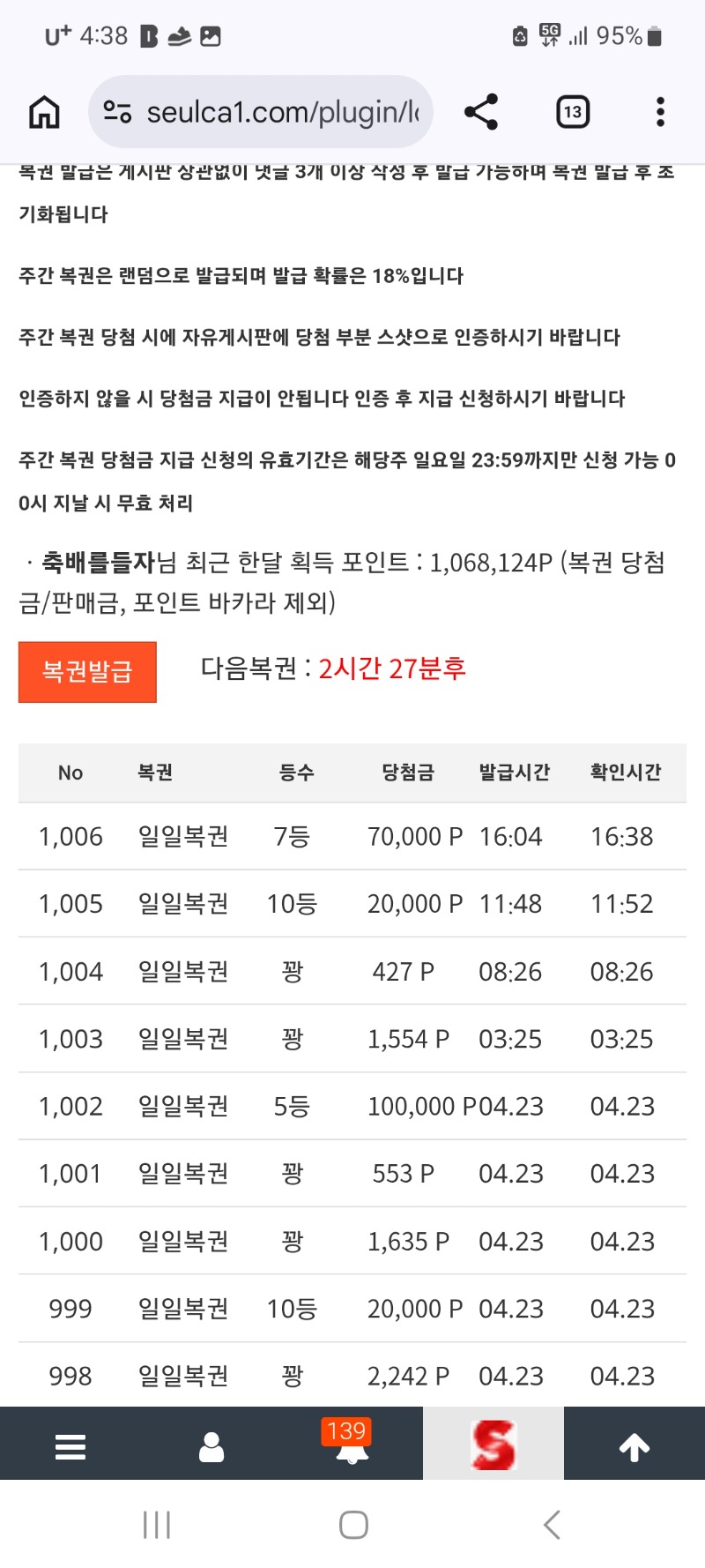 오늘 일복당첨3번째 축배를들자 3 0 0 16:46:08 와 내게도 이런일이 있군~~~ 오늘하루 감사합니다 주복1등 도 부탁드려요ㅎㅎ 0 0 https://seulca1.com/bbs/board.php?bo_table=free&wr_id=3829794 Author 3 0 Lv.13 축배를들자 13 21,270,221 (65%) 축배를들자님 보유 포인트 : P 788,506 04.24 아싸 사자럭포 감사합니다 04.24 맛저하시고 즐거운 시간 보내세요 +3 04.24 장난으로 하니 겁니잘맞네ㅜㅜ 플가잣ㅅㅅ +3 04.24 이번은 뱅으로 돌려버려 +3 04.24 스타트는 플가자ㅅㅅㅅ