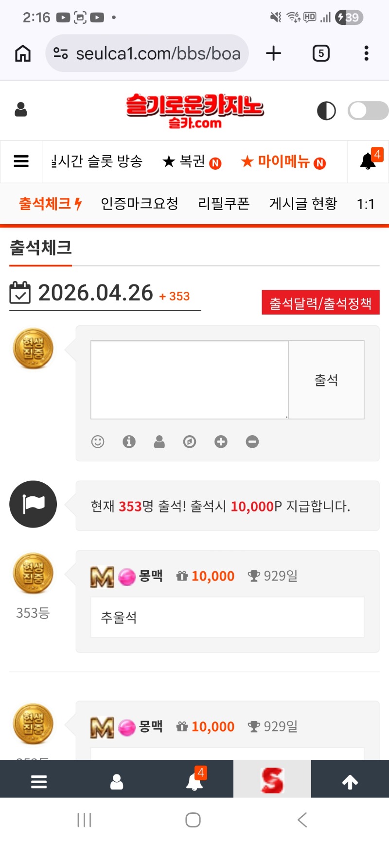 한주마무리도 출석부터~! 몽맥 2 0 0 02:17:16 *기프티콘 바코드 노출 주의* <- 만근 갓짜~!! 0 0 https://seulca1.com/bbs/board.php?bo_table=free&wr_id=3835122 Author 51 26 Lv.19 몽맥 19 224,627,184 (0%) 몽맥님 보유 포인트 : P 526,200 +2 04.26 한주마무리도 출석부터~! +10 04.26 집에 들어와 늦은저녁~?야식 04.26 리필갓짜~깡치기는 손해ㅠ +1 04.26 [비밀글] 교환 04.26 오늘 맛도리 수익마감한 달달이 추겜당첨
