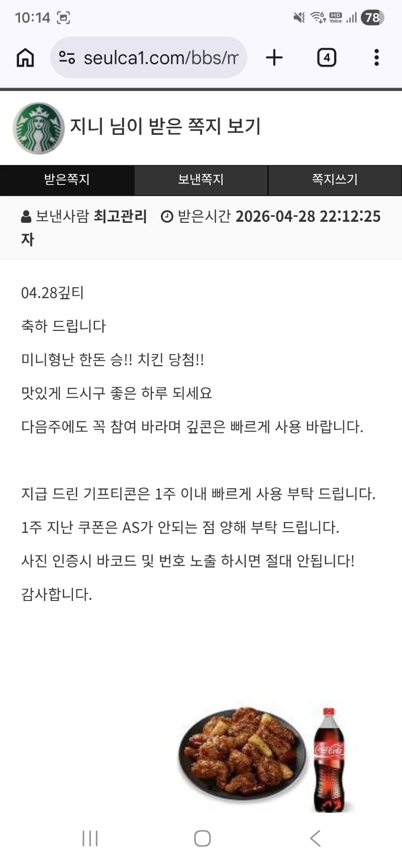 치키니 감사합니다 ~~ 지니 4 0 0 04.28 22:15 *기프티콘 바코드 노출 주의* <- 치킨 쿠폰 도착!! 감사합니다 ~ 0 0 https://seulca1.com/bbs/board.php?bo_table=free&wr_id=3845894 Author 5 2 Lv.16 지니 16 60,619,451 (53%) 지니님 보유 포인트 : P 2,773,806 +22 04.29 일복이 8등 당첨 ~ 04.29 출첵 04.29 미형 치키니 도착~~ +4 04.28 치키니 감사합니다 ~~ +4 04.28 앗싸~~미니형난 오리 치킨당첨!!