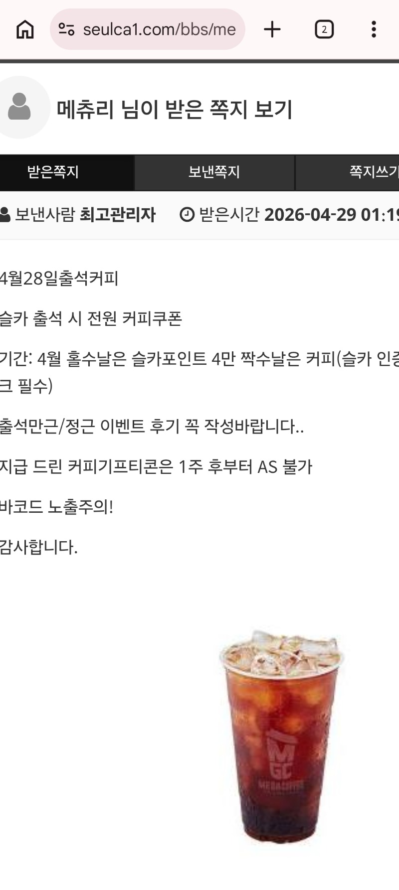 출석커피 감사합니다ㅅㅅ 메츄리 2 0 0 01:39:14 *기프티콘 바코드 노출 주의* <- 0 0 https://seulca1.com/bbs/board.php?bo_table=free&wr_id=3846549 Author 1 0 Lv.8 메츄리 8 3,813,785 (81%) 메츄리님 보유 포인트 : P 1,040,054 +1 04.29 어제 부터 계좌 변경으로... +2 04.29 출석커피 감사합니다ㅅㅅ +2 04.29 출첵!! +11 04.28 좀비 4302배 +6 04.28 일복9등 나이쑤~~~~