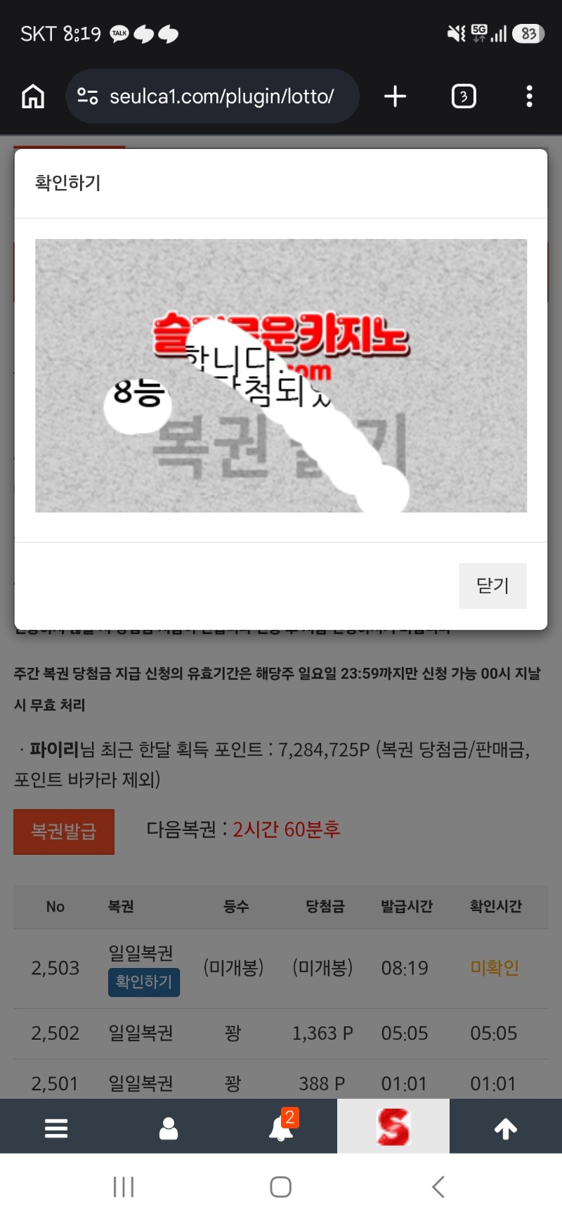 일복당첨8등 감사합니다 파이리 6 1 0 08:20:35 *기프티콘 바코드 노출 주의* <- 300만포교 다왔다잉! 1 0 https://seulca1.com/bbs/board.php?bo_table=free&wr_id=3850876 Author 3 1 Lv.13 파이리 13 21,113,587 (62%) 파이리님 보유 포인트 : P 2,989,987 +6 04.30 일복당첨8등 감사합니다 +6 04.30 만근신청합니다 +10 04.29 아진짜 이번주 만근포받고 포교 300만할수있다 ㅠㅠㅠ +27 04.29 이것도 죽이봐라 리필받은걸로 깡쳤다 ㅡㅡ +6 04.29 적같네진짜...ㅡㅡ 아