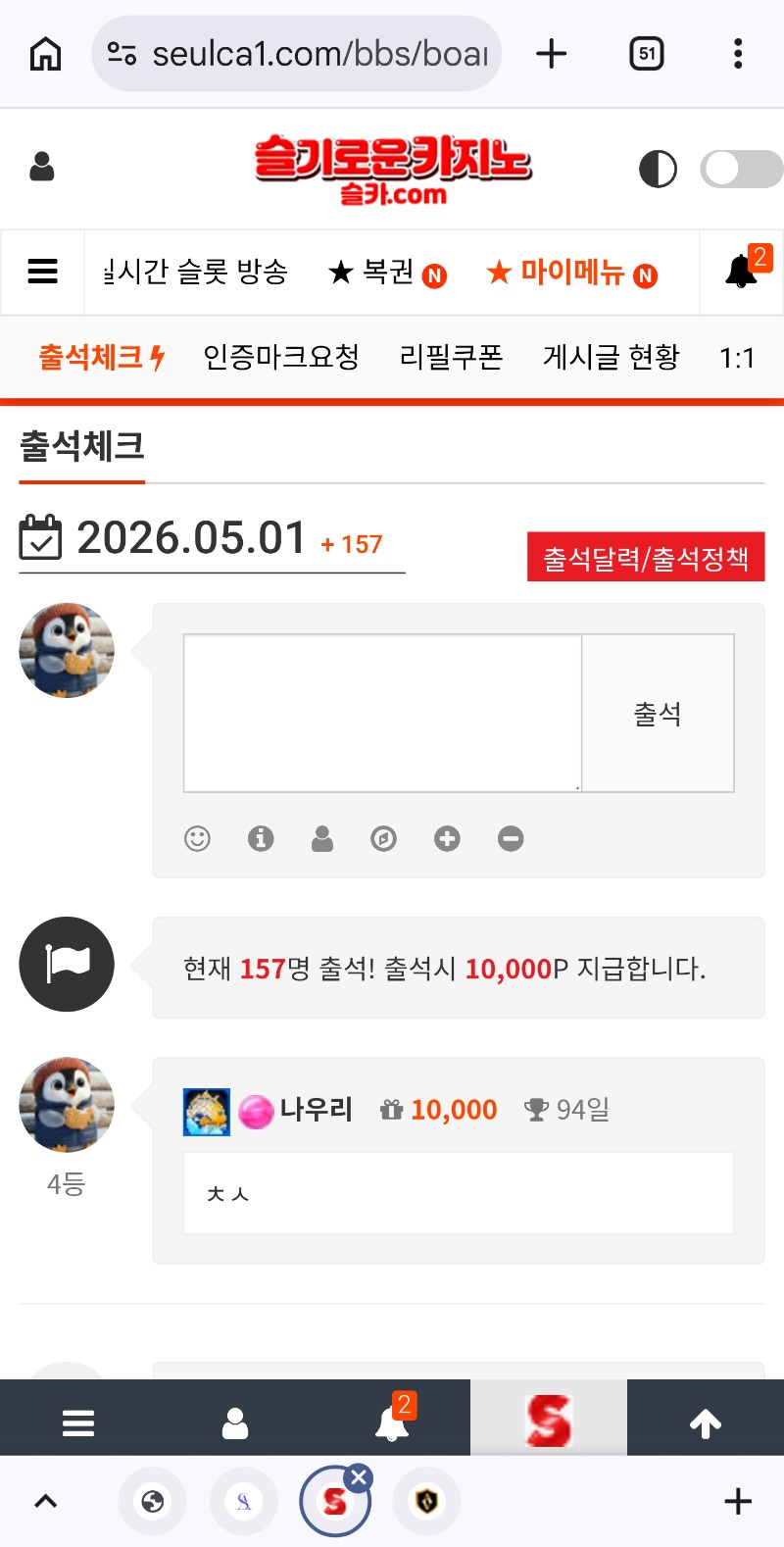 5월도 슬기로운 카지노와 함께라면♡ 나우리 1 0 0 00:16:06 0 0 https://seulca1.com/bbs/board.php?bo_table=free&wr_id=3854280 Author 1 0 Lv.11 나우리 11 10,074,213 (2%) 나우리님 보유 포인트 : P 89,702 +4 05.01 만근 신청합니다 +1 05.01 5월도 슬기로운 카지노와 함께라면♡ 04.30 가족방 형난 포인트 사자님 감사합니다~~갓쟘 비버님도 고생하셨습니다 +40 04.30 빅볼러 10배당 +21 04.30 빅볼러 보너스 진입3회