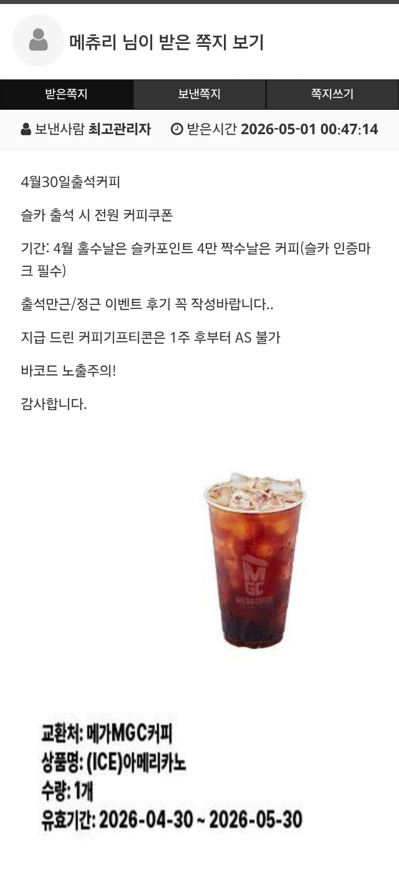 슬카출석커피ㅅㅅ감사합니당 메츄리 0 0 0 00:51:57 *기프티콘 바코드 노출 주의* <- 0 0 https://seulca1.com/bbs/board.php?bo_table=free&wr_id=3854444 Author 1 0 Lv.8 메츄리 8 3,999,080 (99%) 메츄리님 보유 포인트 : P 269,278 05.01 슬카출석커피ㅅㅅ감사합니당 +1 05.01 [비밀글] 포교신청 +2 04.30 왕중왕전 3등당첨ㅅㅅ 모두고생많았어용 ~~ +7 04.30 만근신청 04.30 형난챠걈ㅋㅋ