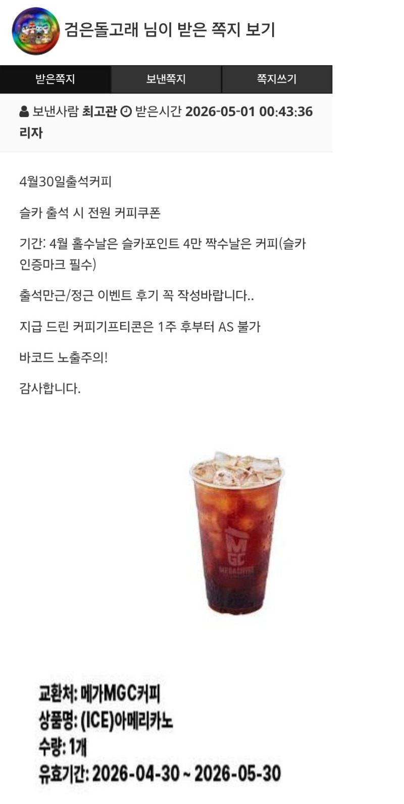 출첵 커피 도착ㅎ 검은돌고래 0 0 0 03:43:09 *기프티콘 바코드 노출 주의* <- 이벤트 마지막 커피가 왓네요ㅠ 잘 마시겠습니다 감사합니다 ^^ 0 0 https://seulca1.com/bbs/board.php?bo_table=free&wr_id=3854613 Author 9 5 Lv.19 검은돌고래 19 172,292,425 (0%) 검은돌고래님 보유 포인트 : P 3,283,429 05.01 출첵 커피 도착ㅎ +7 05.01 블랙잭 아 졋네ㅠㅠ +7 05.01 블랙잭 승리 ㅅㅅㅅ +6 05.01 블랙잭 비겻네 ㅎㅎ 05.01 출첵합시다 ^^