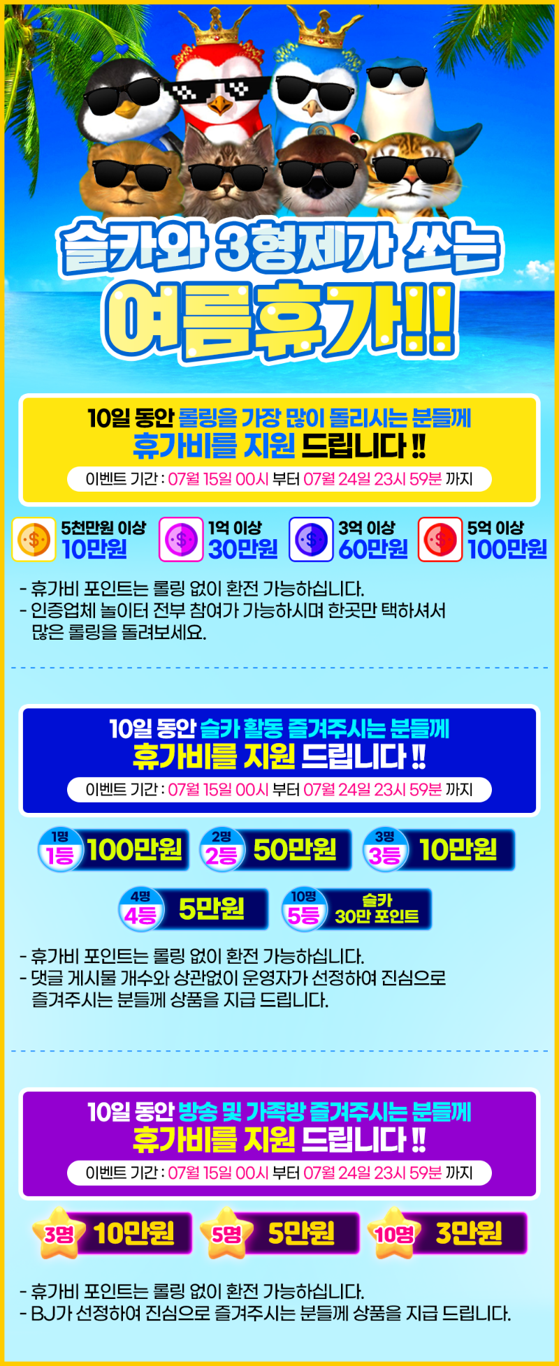 슬카와 3형제가 쏘는 여름휴가 !! 최고관리자 189 22 0 2024.07.08 17:11 궁금하신 내용이나 헷갈리신 내용 있으시면 방송 or 슬카 1:1 문의로 말씀 주시면 빠르게 답변 도와드리겠습니다 :) 첫 번째 롤링 이벤트 참여하실 분들은 댓글에 참여하실 놀이터, 아이디 댓글 같이 남겨주시면 롤링 이벤트 참여가 가능하십니다 댓글 예) 우루스 / abc123 롤링 이벤트는 카지노, 슬롯 롤링 전부 합산 계산입니다. 당첨자 발표 : 07월 26일 20시 (오후 8시) 22 0 https://seulca1.com/bbs/board.php?bo_table=free&wr_id=749463 Author 476 160 Lv.15 최고관리자 15 32,324,497 (11%) 최고관리자님 보유 포인트 : P 4,282,154 +24 04.15 [4월19일] 최고의 바카라 BJ를 맞춰라 77회차 +11 04.15 2026년 04월 15일 Steve 회원님의 롤링 맥스 영상 +29 04.15 2026년 04월 15일 망고 회원님의 올림푸스 슈퍼스케터 맥스 영상 +2 04.15 [4월15일] 394회차 오늘의 배당을 찾아라. 번호 발표!! +8 04.14 [4월15일] 394회차 오늘의 배당을 찾아라. 번호 발표!!